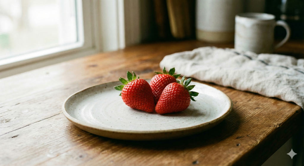 テーブルの上に、真っ赤なイチゴが3つ乗ったお皿があります。