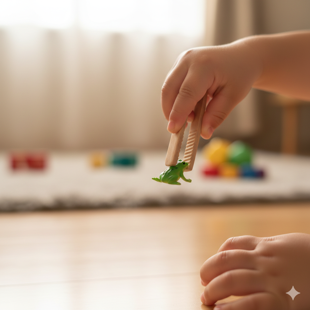 では、どうやって「量感」を教えればいいのでしょうか? 言葉で教える必要はありません。使うのは「指先」です。洗濯ばさみで遊んだり、トングでおもちゃを掴んだり。